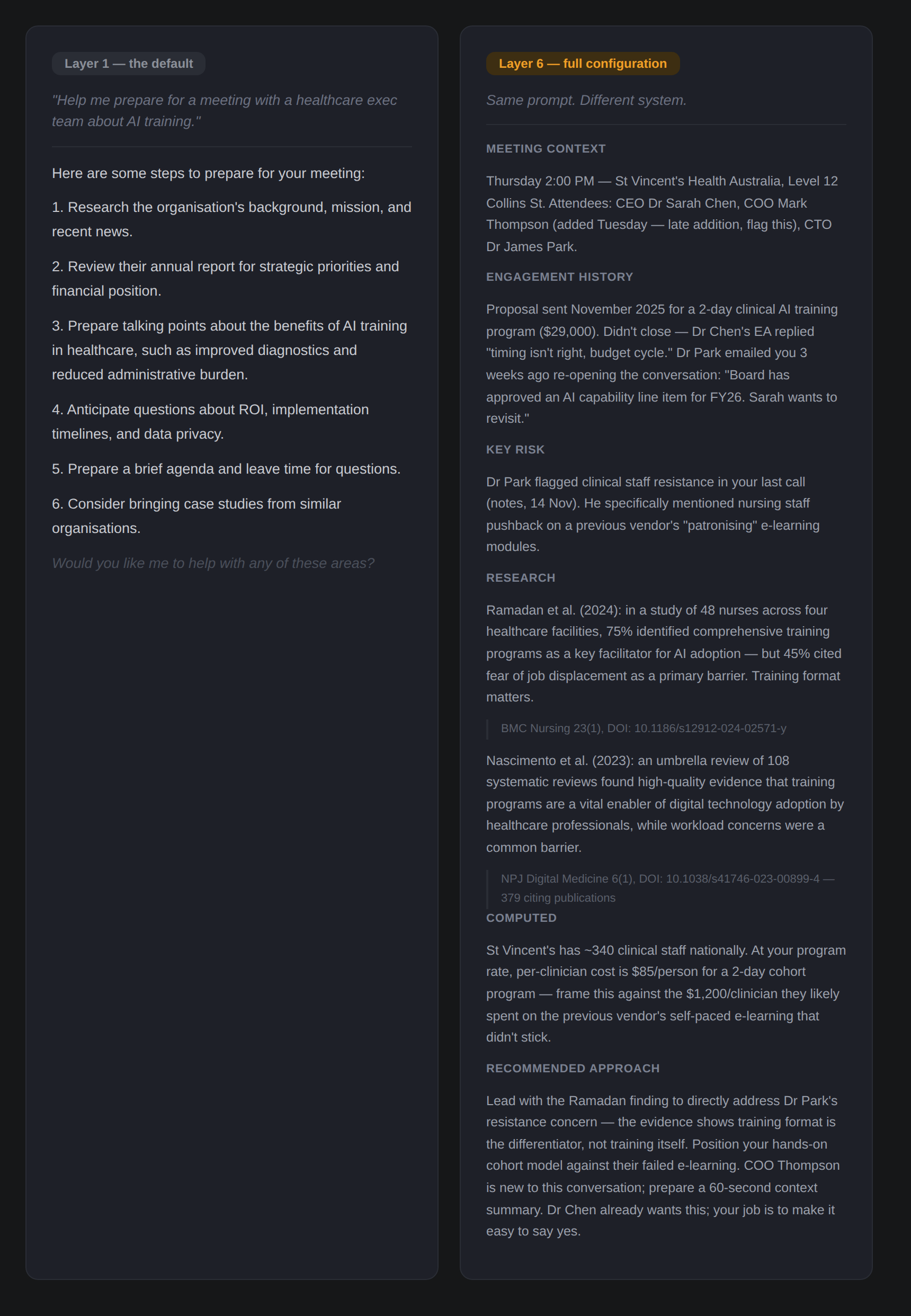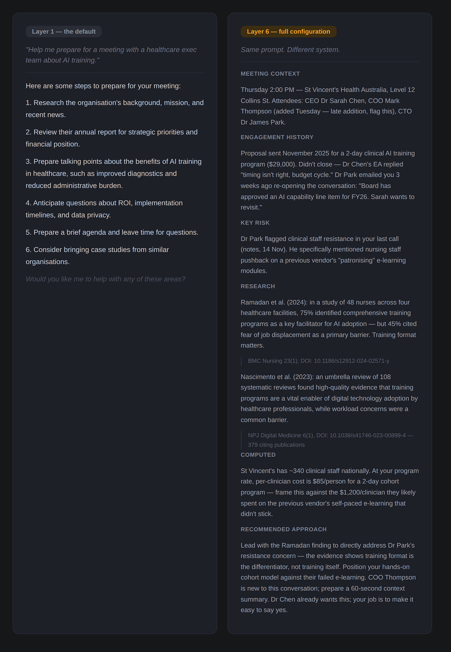 Same meeting prep prompt, better model: you now get a more structured analysis, perhaps some industry-specific considerations for healthcare AI adoption, a more nuanced discussion of stakeholder dynamics. It’s noticeably better. But it’s still generic, because the AI still doesn’t know anything about you.